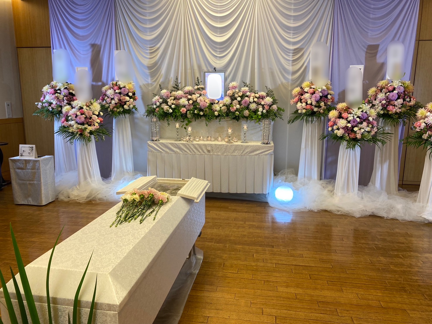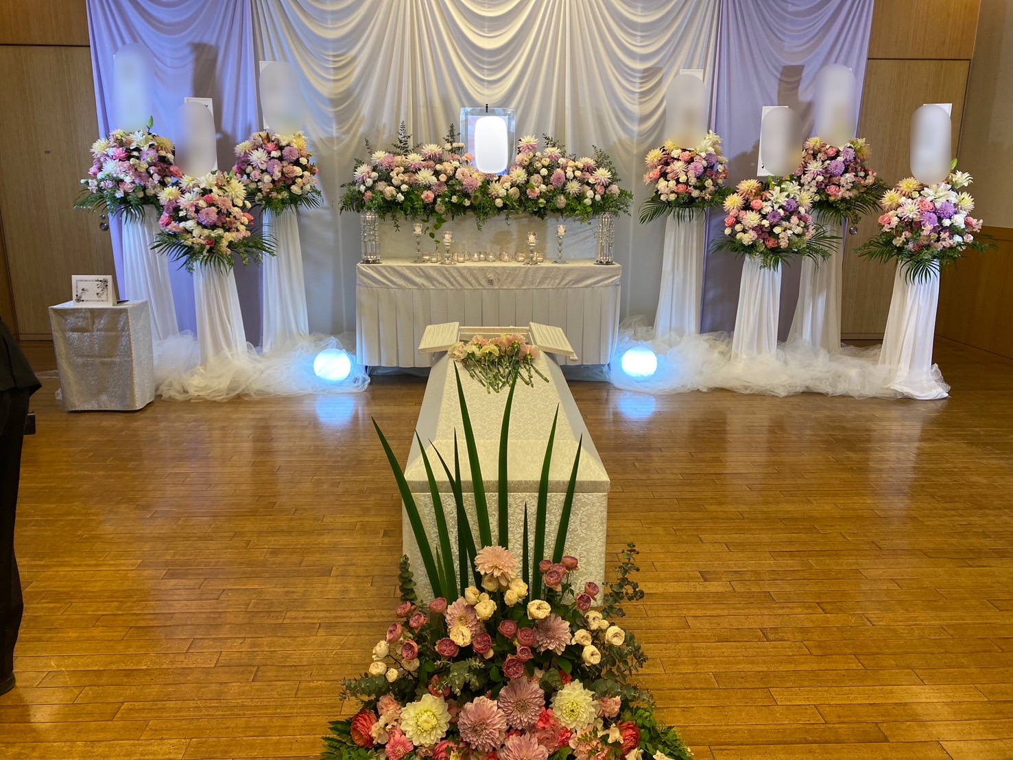 淡いピンクを基調に、やわらかくあたたかな印象の生花祭壇をご用意しました。優しい色合いのお花でまとめ、穏やかで心落ち着く空間に仕上げています。