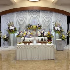 二葉リビングにて、明るい色合いのお花をふんだんに使用し、お花畑のような生花祭壇をご用意しました。やさしく華やかな雰囲気の中に、故人様のお人柄を感じられる空間に仕上げています。