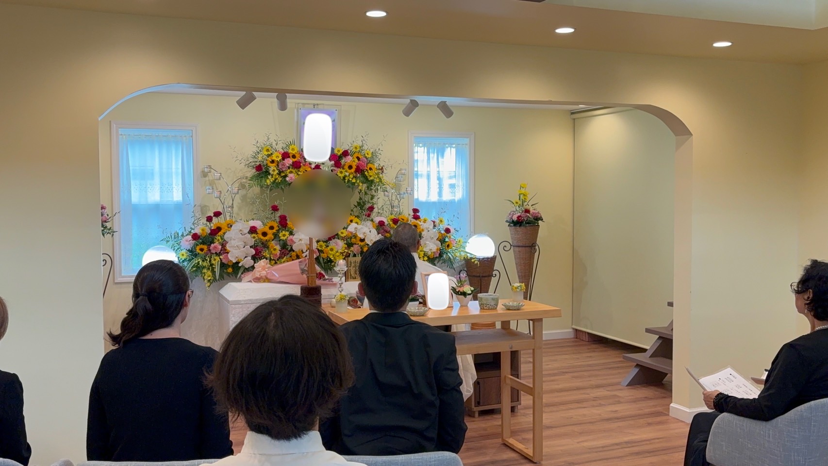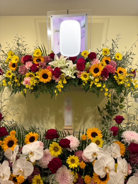 二葉リビングにて、ひまわりと胡蝶蘭を取り入れた生花祭壇をご用意しました。明るさと上品さを合わせ持つ花々でお飾りし、脇にはアレンジメントバスケットを添えて、あたたかみのある空間に仕上げています。