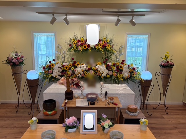 二葉リビングにて、ひまわりと胡蝶蘭を取り入れた生花祭壇をご用意しました。明るさと上品さを合わせ持つ花々でお飾りし、脇にはアレンジメントバスケットを添えて、あたたかみのある空間に仕上げています。