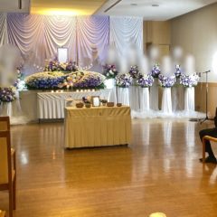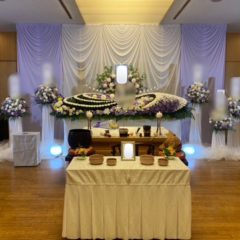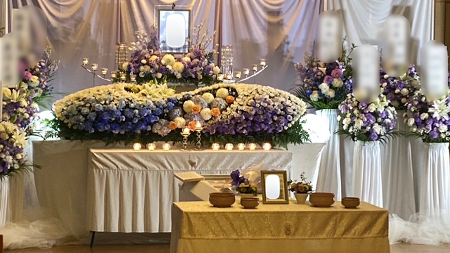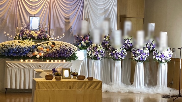 青・白・紫を基調に、流れるようなS字のデザインが印象的な花祭壇をお選びいただきました。動きのあるラインと色合いが美しく調和し、上品さの中にも華やかさを感じられる、存在感のある祭壇に仕上げています。