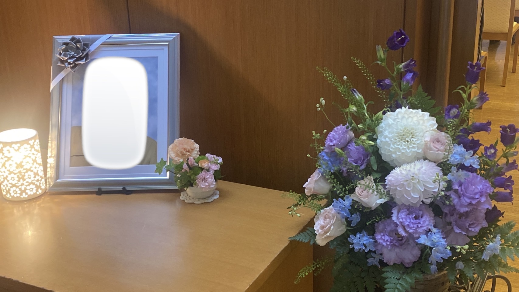| 二葉のコメント | 喪主を務められた奥様を中心に、ご家族様に見守られながら穏やかなお見送りとなりました。式場の入り口には、お写真やアレンジメントが飾られ、訪れる方々が足を止めて故人様との思い出に触れられるあたたかな空間に。また、ご葬儀までは一度ご自宅へお帰りになられ、ご家族様とゆっくりとした時間を過ごされました。ご自宅でのひとときは、故人様を想うご家族のやさしいお気持ちが感じられる、大切な時間だったのではないかとおもいます。祭壇のやわらかな色合いと灯りに包まれながらのお旅立ちとなりました。 |