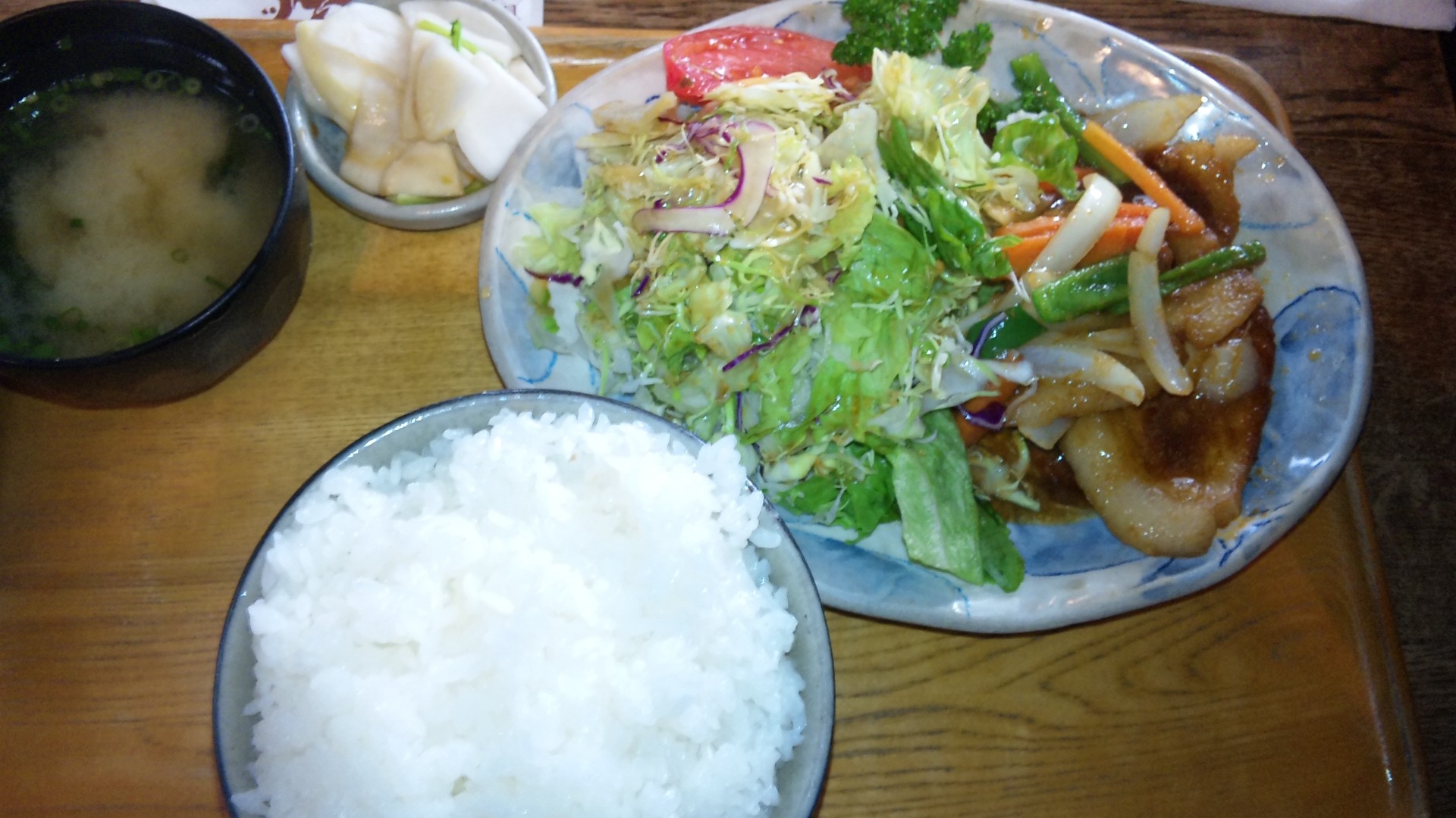 お肉の料はもちろん。ごはんや付け合せのサラダにおしんこ(ぬか漬け)も、たっぷり!